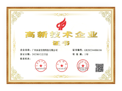 自成立以來,公司已公開申請專利66項,其中有57項已授權(quán),廣東省名優(yōu)高新技術(shù)產(chǎn)品2項。憑借強(qiáng)大的研發(fā)實力和創(chuàng)新能力,永諾生物成功入選大灣區(qū)生物科技創(chuàng)新企業(yè)50強(qiáng)、國家高新技術(shù)企業(yè)、廣州市科技創(chuàng)新小巨人企業(yè)、廣東省高新技術(shù)企業(yè)培育庫入庫企業(yè)、廣州市企業(yè)研發(fā)機(jī)構(gòu)等榮譽(yù)。2023年永諾生物榮登首屆廣州百家新銳企業(yè)"銳100"名單;2024年公司榮獲"廣東省專精特新中小企業(yè)"稱號。